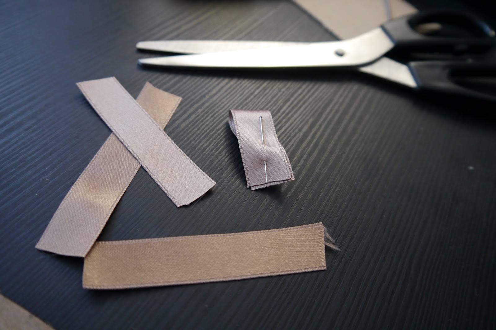 Pour couper le ruban c’est comme pour le tissu, moi je vise large^^. Et le satin à tendance à ne pas bien se tenir alors je l’épingle pour que la boucle reste bien en place.