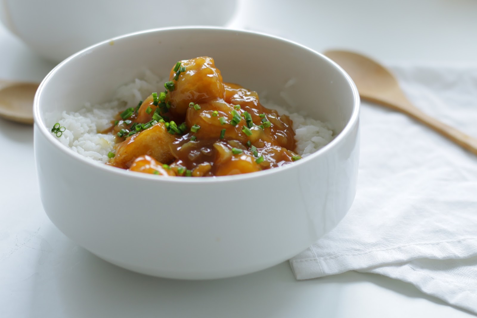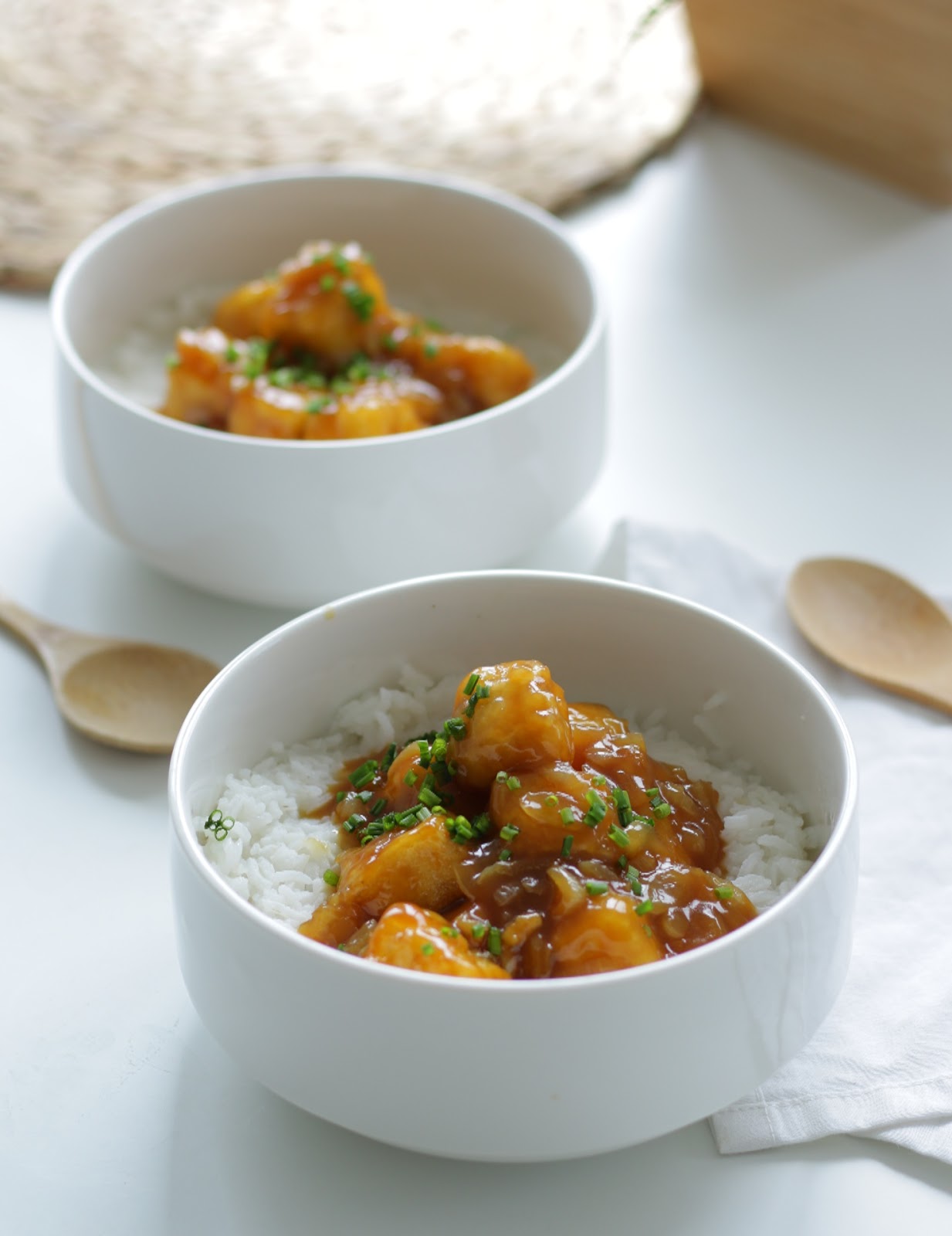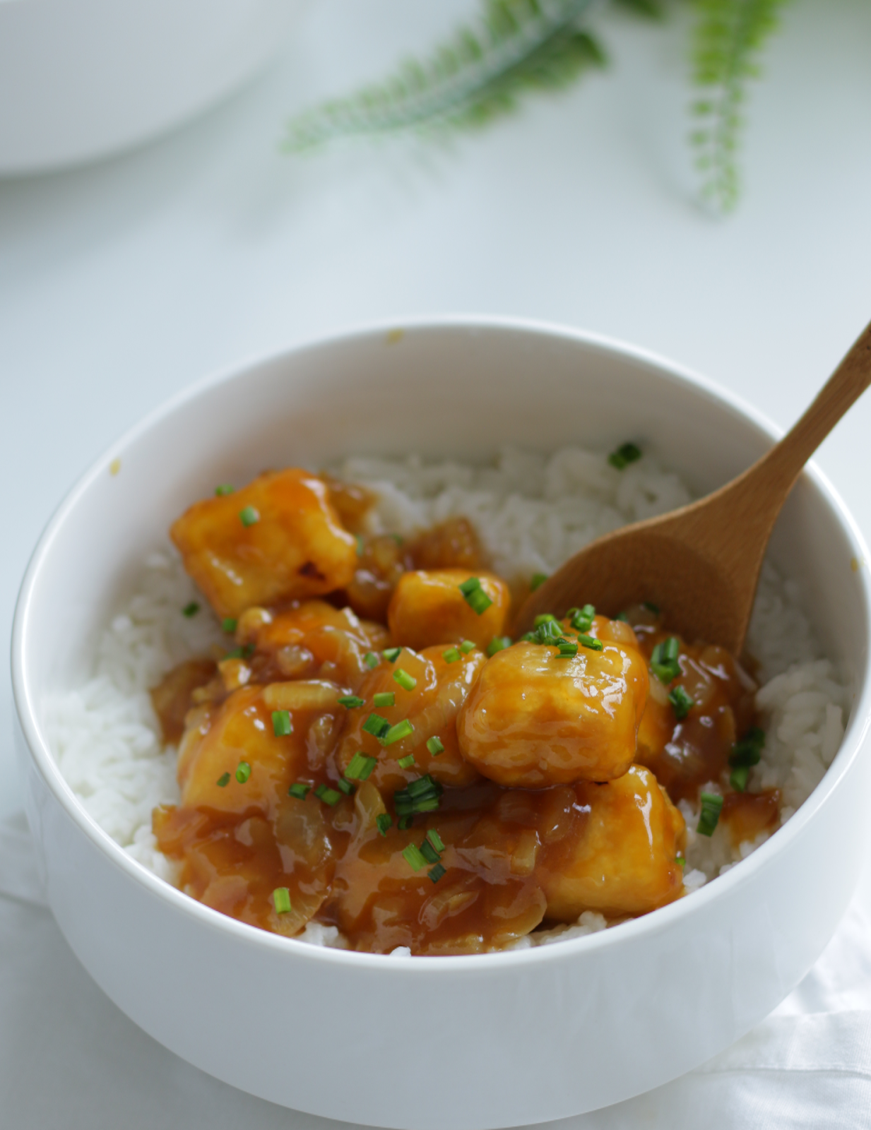 - Faire revenir un oignon émincé, ajouter le tofu et les ingrédients de la sauce, lorsqu’elle commence à épaissir ajouter l’eau et 1/2 càc de maïzena.